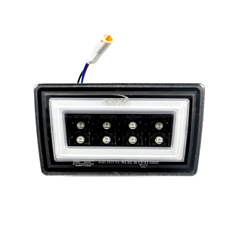 This beautiful rear brake light comes with 8 Red LEDs and a Red trapezoid light bar that is the daytime running light function. The 8 LEDs in the center are both a hyper flashing F1 style brake light or a solid brake light which can be quickly changed from the drivers seat.